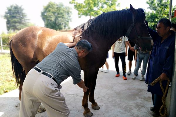 为提高教学效果,6月21日,党瑞华副教授带队选修马业概论课程的学生赴宝鸡市眉县关中马保种场进行现场教学,我院退休教授侯文通受邀现场示范指导。